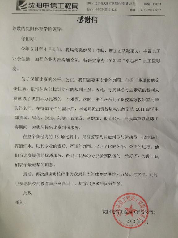 2013年3月—4月期间,沈阳电信工程局(有限公司)举办了2013“卓越杯”员工篮球赛,该单位与篮球教研室积极沟通并聘请我院运动训练专业2011级篮球裁判班学生为本次比赛做裁判服务工作。学生们的出色表现得到了该局领导及参赛队伍的一致好评,特送感谢信一封和锦旗一面。