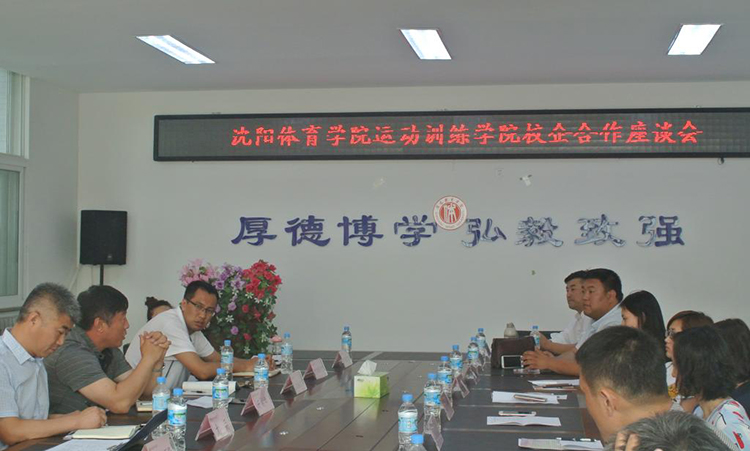 在校企合作座谈会上,运动训练学院院长于树祥、党总支书记尤兵、各教研室主任与各企业代表进行了深入交流。