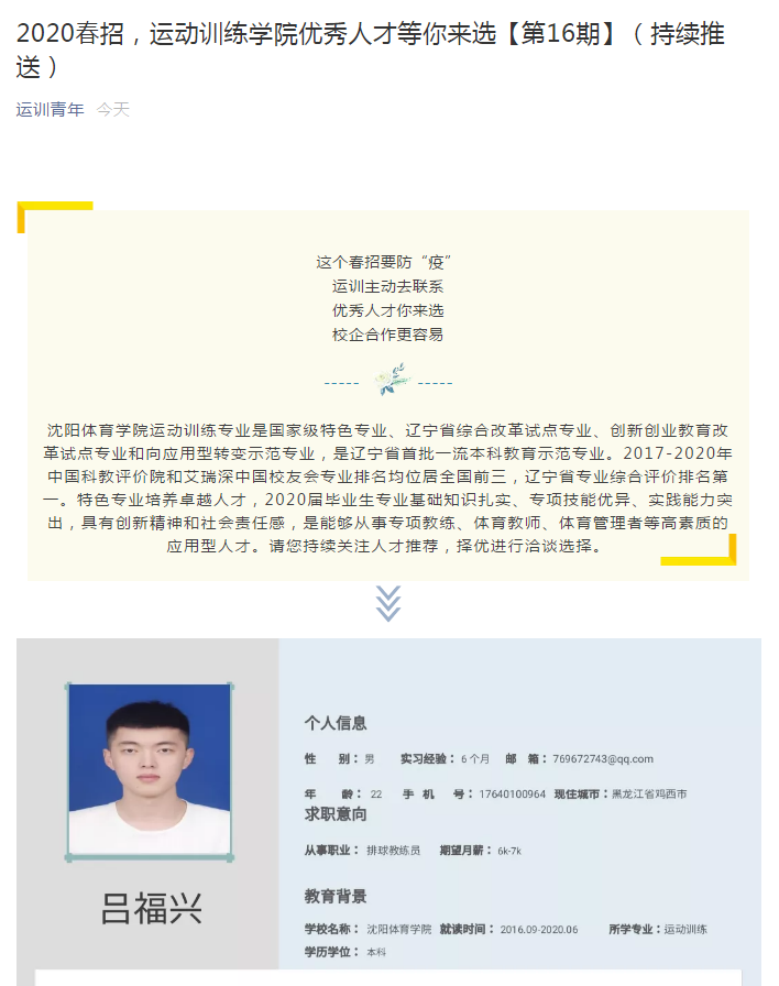 为克服新冠肺炎疫情影响,传统大型就业双选会、中型就业洽谈会、小型就业专场会都无法进行,只能通过线上方式连线企业用人与毕业生需求。为了更好实现互动,让用人单位更多的接触和了解毕业生,运动训练学院创新开展了“优秀人才等你来选”毕业生推荐工作。此项工作由总支领导,毕业年级组织、分团委配合,将学生就业简历分期分批在“运训青年”公众号进行推送。为了扩大影响面,党总支号召全体教职工将公众号推荐内容进行转发,力争为学生创造更多的就业机会。
