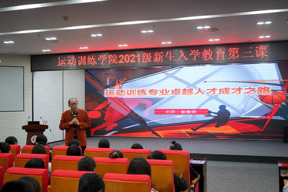 10月15日,运动训练学院2021级新生入学教育第三课在图书馆二楼报告厅继续开讲,运动训练学院院长崔鲁祥教授以“运动训练专业卓越人才成才之路”为题进行讲授。