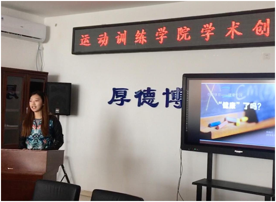 第三位分享者是18级研究生张晓月同学,她说我们学校教育应把学生的健康放在第一位,健康应包括生理健康、心理健康、社会适应性良好和道德健康四个方面。这是国家的要求,也是民族发展的需要。学生自进校经过十多年没有培养出学生的运动爱好和专长,我们正源源不断地把一批批缺乏健康知识、体育知识技能的,没有体育兴趣喜欢的、健康状态欠佳的青少年推进社会,在推进日益昂贵的医疗系统中去。因此,我们必须在学校教育阶段把学生的“生命观”“健康观”“运动观”“休闲观”建立起来。加快推进体育强国建设,达成健康中国梦想而努力!