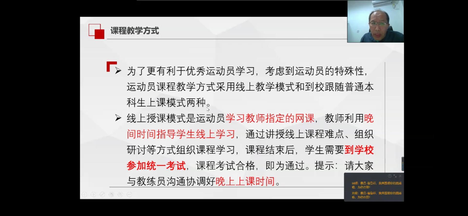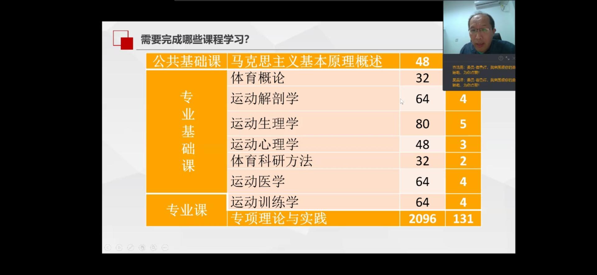 崔鲁祥详细解读了培养方案,让同学们进一步明晰了毕业和学分要求。同时要求同学们转变观念,要以大学生的标准要求自己,在训练之余拿出时间重视自己的学业,通过学习和研究,理论和实践相结合,增强个人的专业能力。为了使优秀运动员明确如何参与课程学习,崔鲁祥公布了本学期所开课程,同时将更适合于优秀运动员的混合式学习模式向同学们进行了介绍,线上学习、线上作业、线上辅导的混合式教学模式使得优秀运动员在比赛训练之余能够实现完整的课程学习。