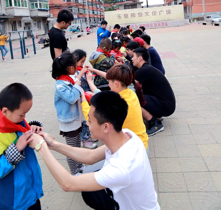 爱心团队的志愿者为孩子们系红领巾