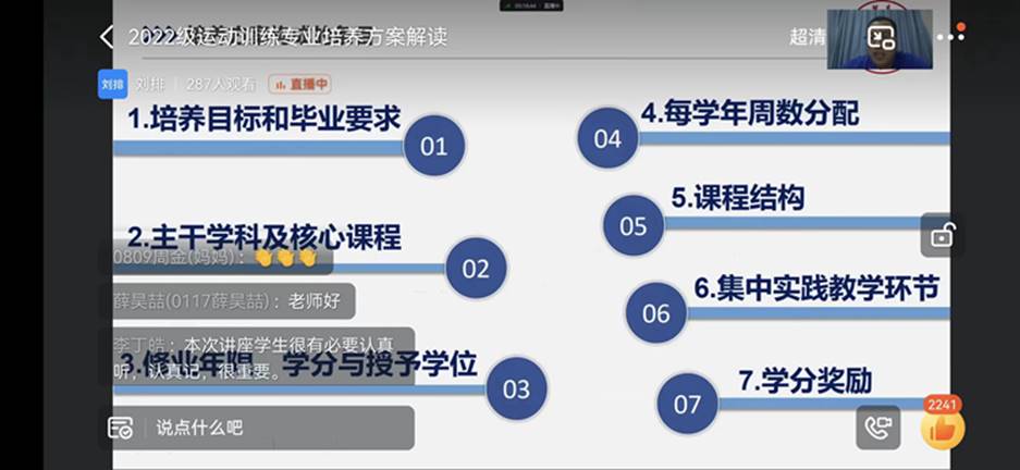 为帮助2022级新生明确学习目标,明晰成长路径,端正学习态度,科学规划学涯。9月14日,运动训练学院利用钉钉直播的方式组织开展了运动训练专业培养方案解读会,会议由运动训练学院副院长刘排教授主讲,2022级全体学生及部分学生家长参加会议,会议由辅导员王世明主持。